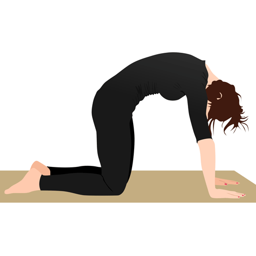 Keep your hands shoulder-width apart and your knees directly below your hips. Inhale deeply while curving your lower back and bringing your head up, tilting your pelvis up like a “cow.” Exhale deeply and bring your abdomen in, arching your spine and bringing your head and pelvis down like a “cat.” Repeat 10 times.
